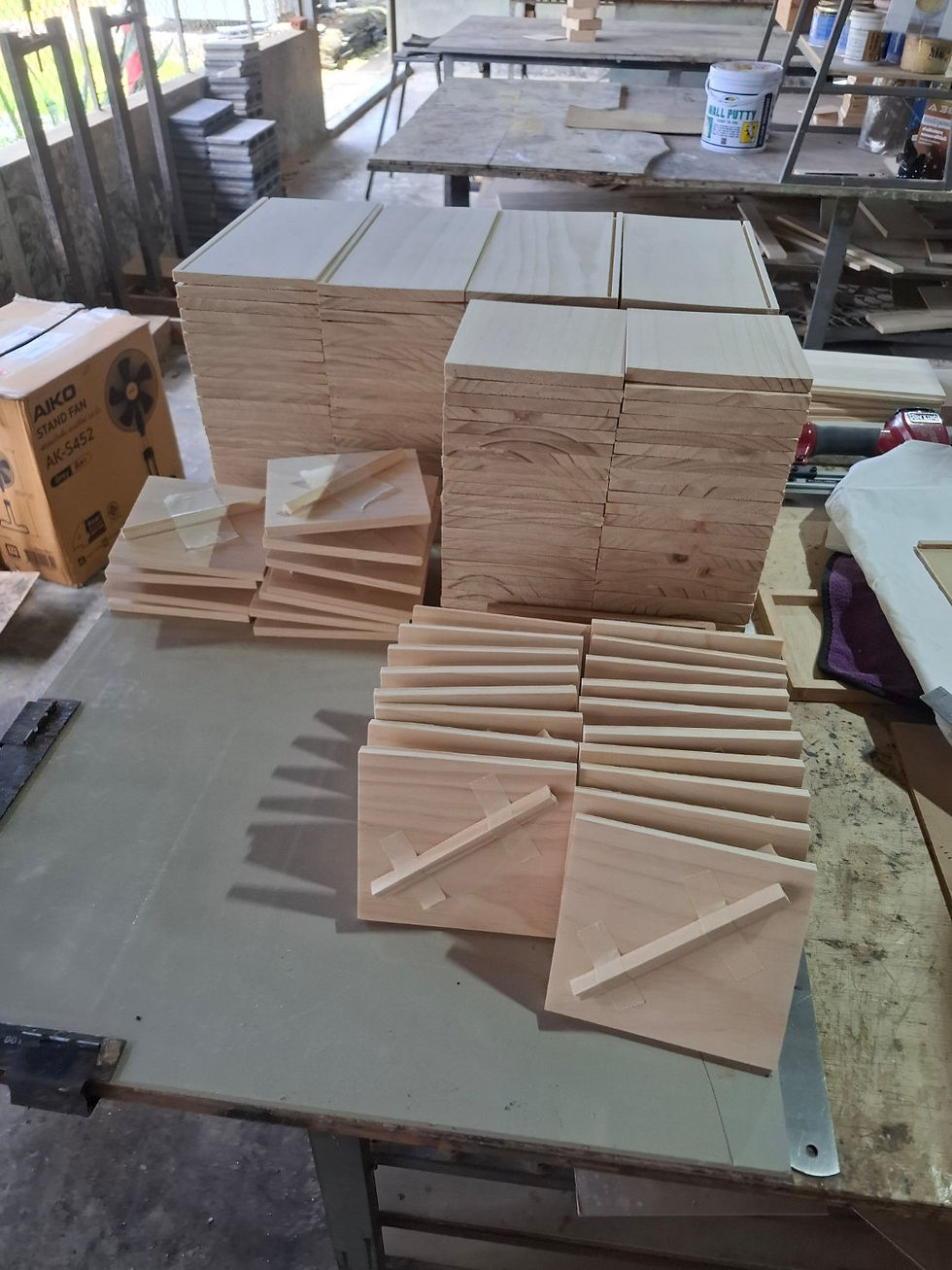 งานขัดกระดาษทรายแผ่นไม้ด้านในเสร็จแล้ว รอยิงประกอบ/ งานเรียบร้อย
